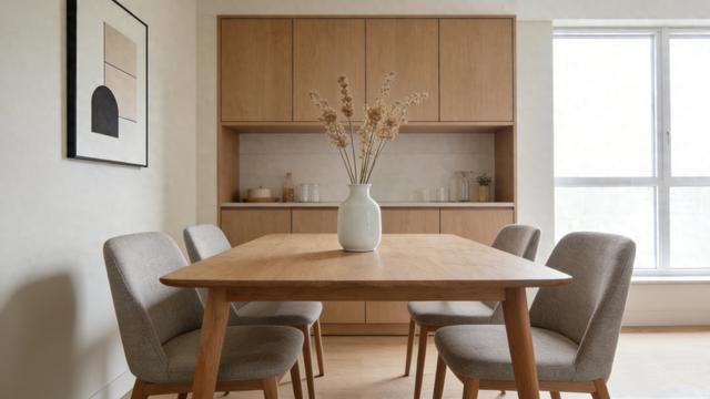 个人建议选择定制餐边柜,尤其小户型,可根据餐厅尺寸、格局量身打造,贴合墙面不浪费空间;尤其是不规则户型、有柱子的情况,通过定制餐边柜设计,可以实现空间利用最大化。